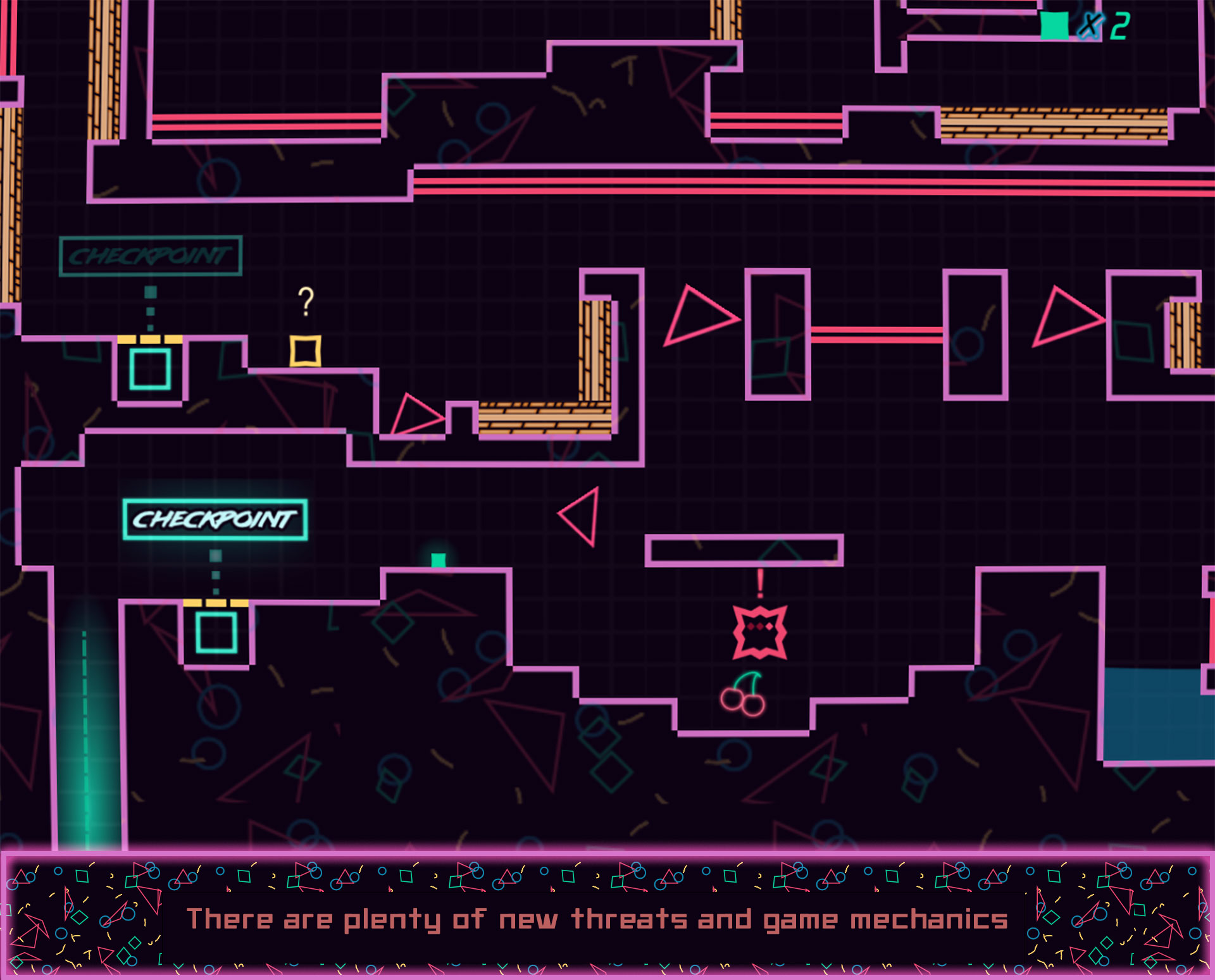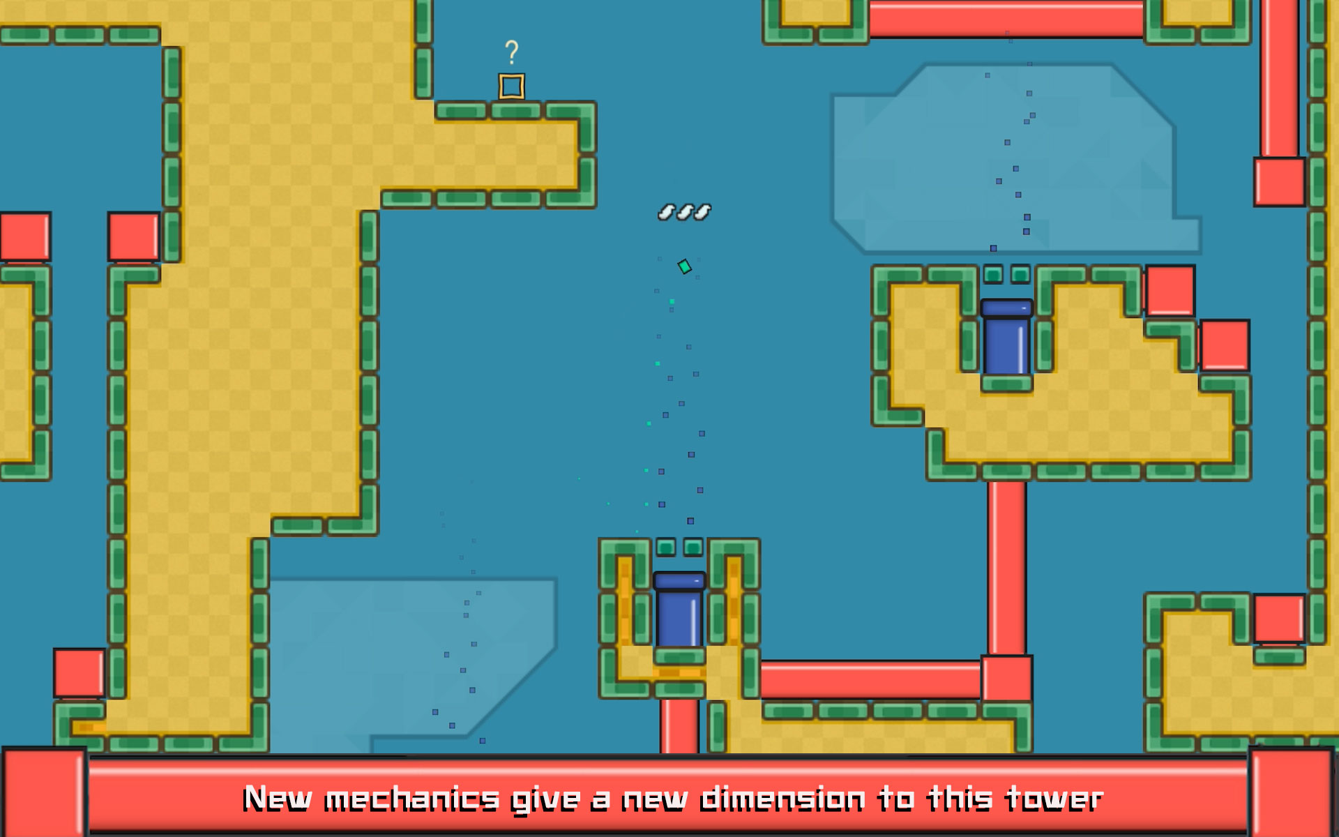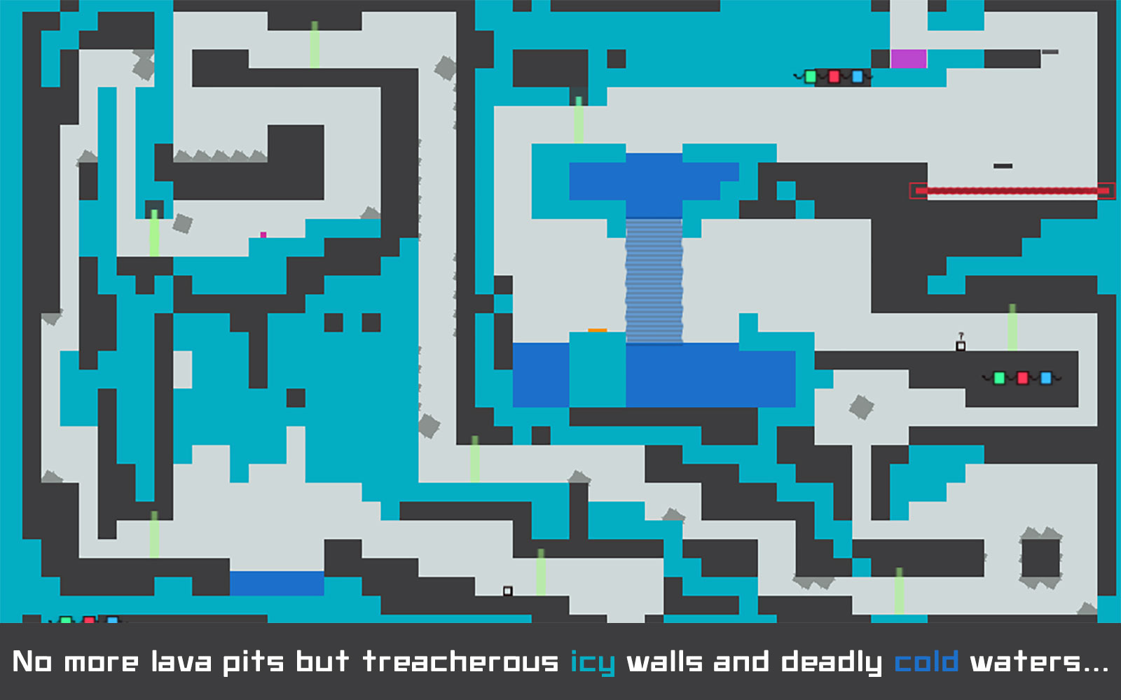 Like its predecessor, Big ICE Tower Tiny Square is heavily inspired by single-screen arcade games. The game is one giant level divided into large single-screen sections. Each obstacle has been meticulously designed. It will take precision and skill to navigate the maze-like tower.