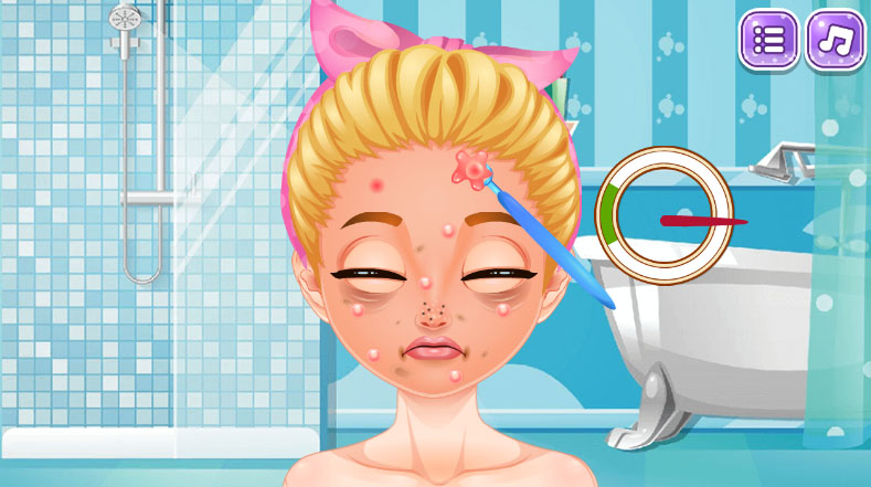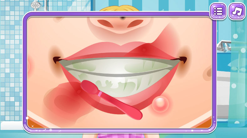 Help her brush her teeth, use the acne treatment kit, remove the bubble gum caught in her hair, put on a face mask, and wash her hair with her preferred shampoo.