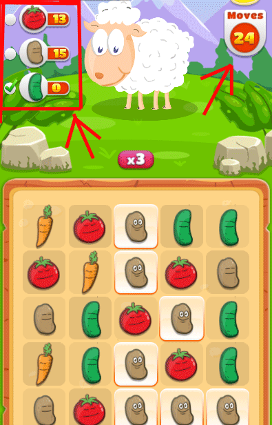which are on the boxes right of the sheep. When you reach the numbers of required vegetables, sheep is full and the level is well done, so you can go to next one.