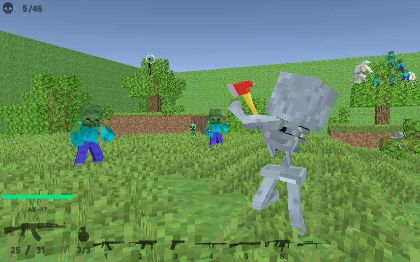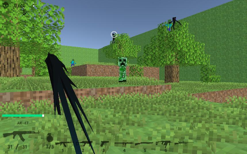 The AI in this is also easy to explain. Enemies will spawn at the different areas when you start the level. Some enemies won’t come at you until you get close enough. But if you spawn close to the enemies stuff will go crazy. The iron golem moves slow but in the original, it comes at you fast, the skeleton runs at you, the zombies walk normally as any other zombie should, the creeper comes at you normally, and the enderman idles. How the enemies and the way they attack is not related to Minecraft at all except the creeper. The attacking is slow, the zombie punch with one fist, the skeleton slings the ax, the iron golem has the attacking as the zombie, and the enderman throws arrows. What’s also not related is the gun models and the deaths. The gun texture isn’t blocky, shooting enemies contains blood & the deaths are ragdolls, it’s very hilarious. Creepers blow up in pieces but don’t destroy any block or grass. Forgot to mention the health bar and the weapons but I think you already know, it’s easy to explain.